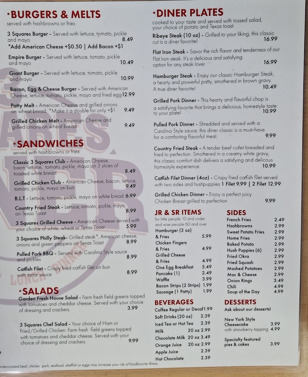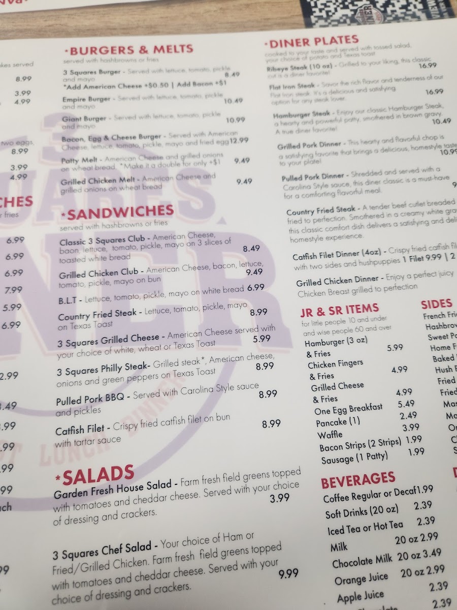 The diner’s sandwiches, including the Grilled Chicken Club and Philly Steak Sandwich, are crafted to fill you up without breaking the bank, blending fresh ingredients with familiar, comforting tastes. The 3 Squares Club and B.L.T bring diner classics to the forefront, each bite offering warmth and satisfaction.